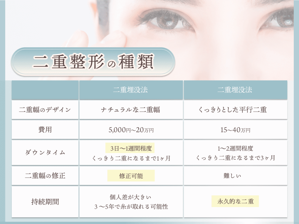 初めて二重整形を行う人は、二重幅の修正が容易でダウンタイムの少ない二重埋没法がおすすめです。